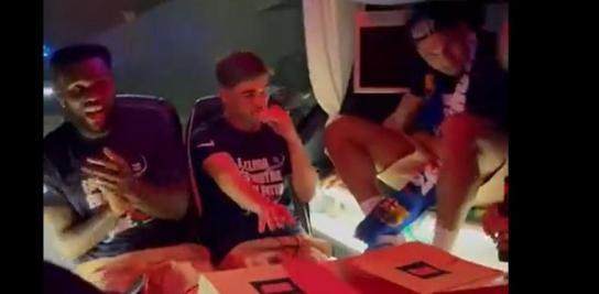巴萨众将身穿“联赛冠军是我们的,未来也是我们的”字样的纪念衫,球队阵中共计有17名球员是第一次收获西甲联赛冠军。阿劳霍仍是众人中最抢镜的那个,他身披乌拉圭国旗,戴着深色的墨镜,反戴着一顶鸭舌帽。本赛季已经打入21球的莱万多夫斯基连连向场边挥手致意,波兰人过去9年以来都能够和球队共同庆祝联赛冠军,而在队友的怂恿下,莱万也在大巴上翩翩起舞。